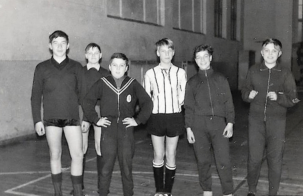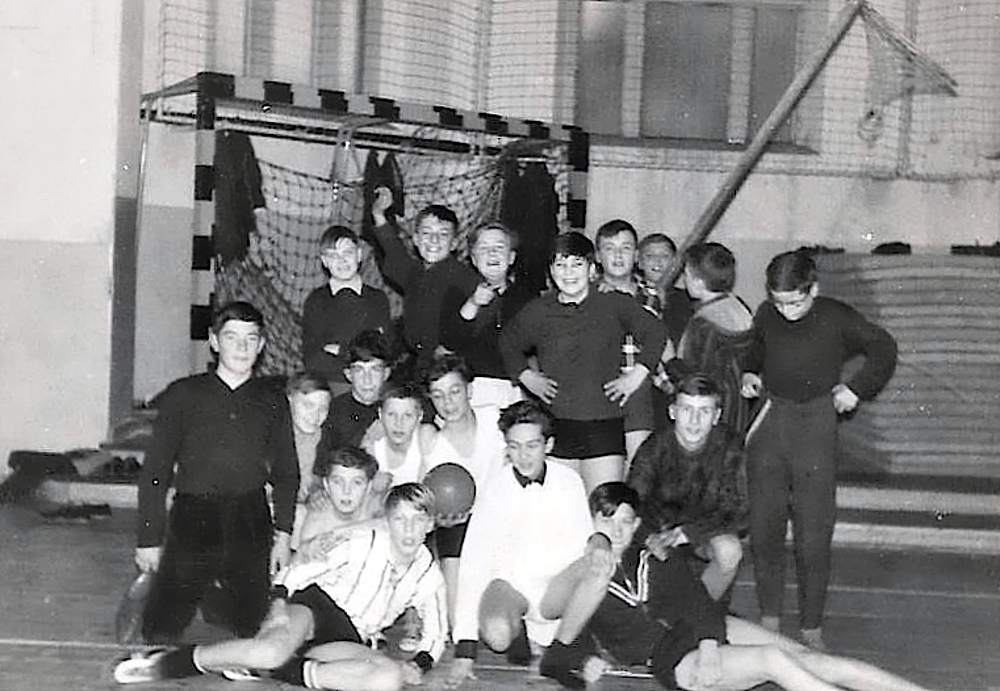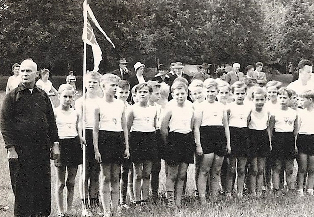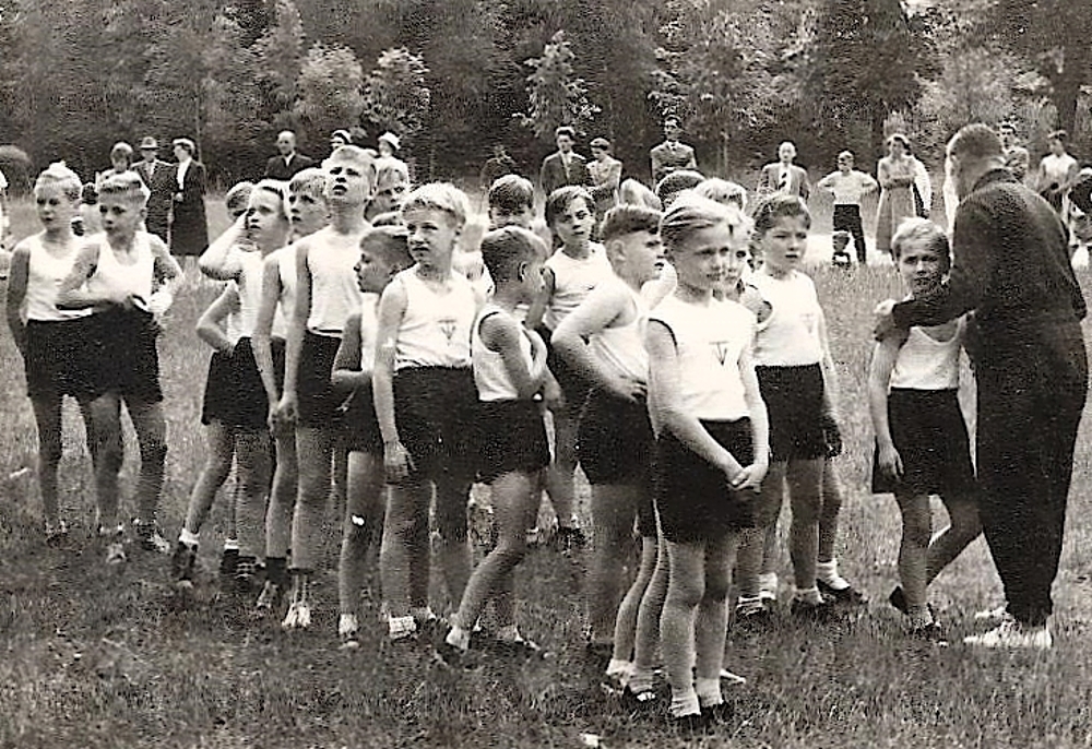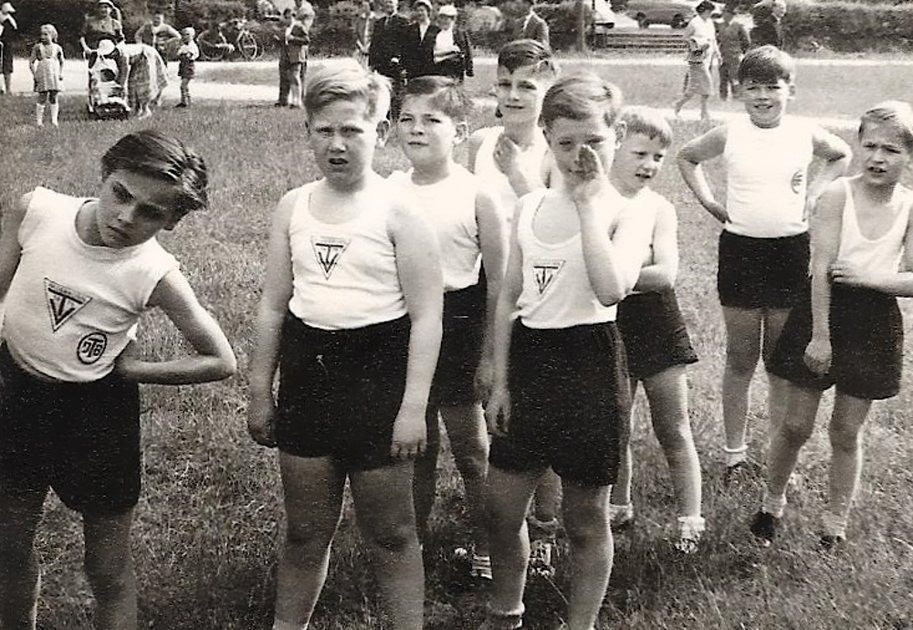 Schulsport wurde seinerzeit gross geschrieben, und fast alle sind im Sportverein TV 1875 angemeldet. Beim Wettkampf im Stadion sind auch die Eltern anwesend. Antreten mit Vereinsflagge, und die Eltern mit kritschen Blick ...