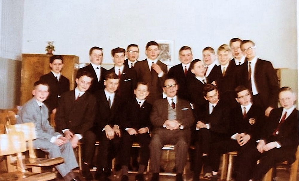 Unsere Abschlussklasse mit 18 Krawatten und eine Fliege (heute unvorstellbar) von links: Pelz, Schaltinat, Prinz, Klatte, Driller, Minten, Ahle,Wolf, Greifenhagen,Wigge,