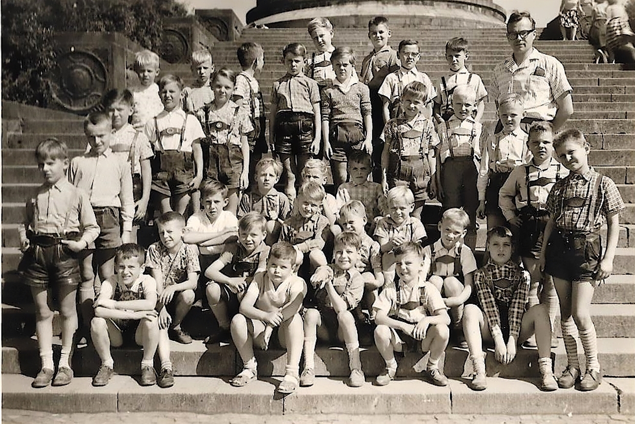Der Unterricht fand in den ersten Jahren von 1957 bis 1960 bei Lehrer Lummer statt, mit dem Klassenfoto 1959/60 beim Hermannsdenkmal.