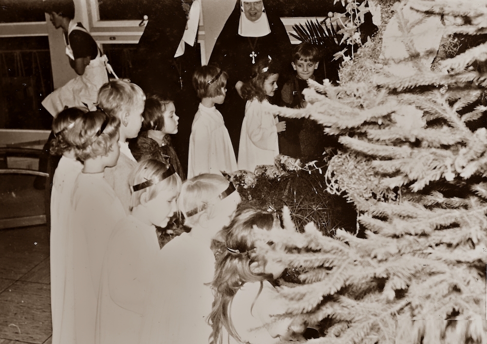 Begeisterte Gesichter beim Anblick des Weihnachtsbaumes, mit dem gebastelten Weihnachstern von Bethlehem. "Ach so ein süsses Kindelein, das muss gewiss vom Himmel sein."
