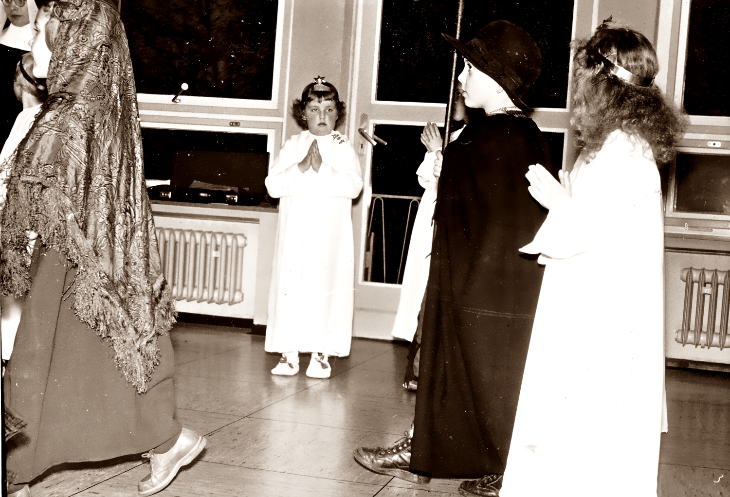 Der feierliche Auftritt mit acht "Engelchen" mit goldenen Haarreif mit Stern, mit weissen Schuhen und mit gefalteten Hände treten auf, Maria und Josef stehen hinten an.