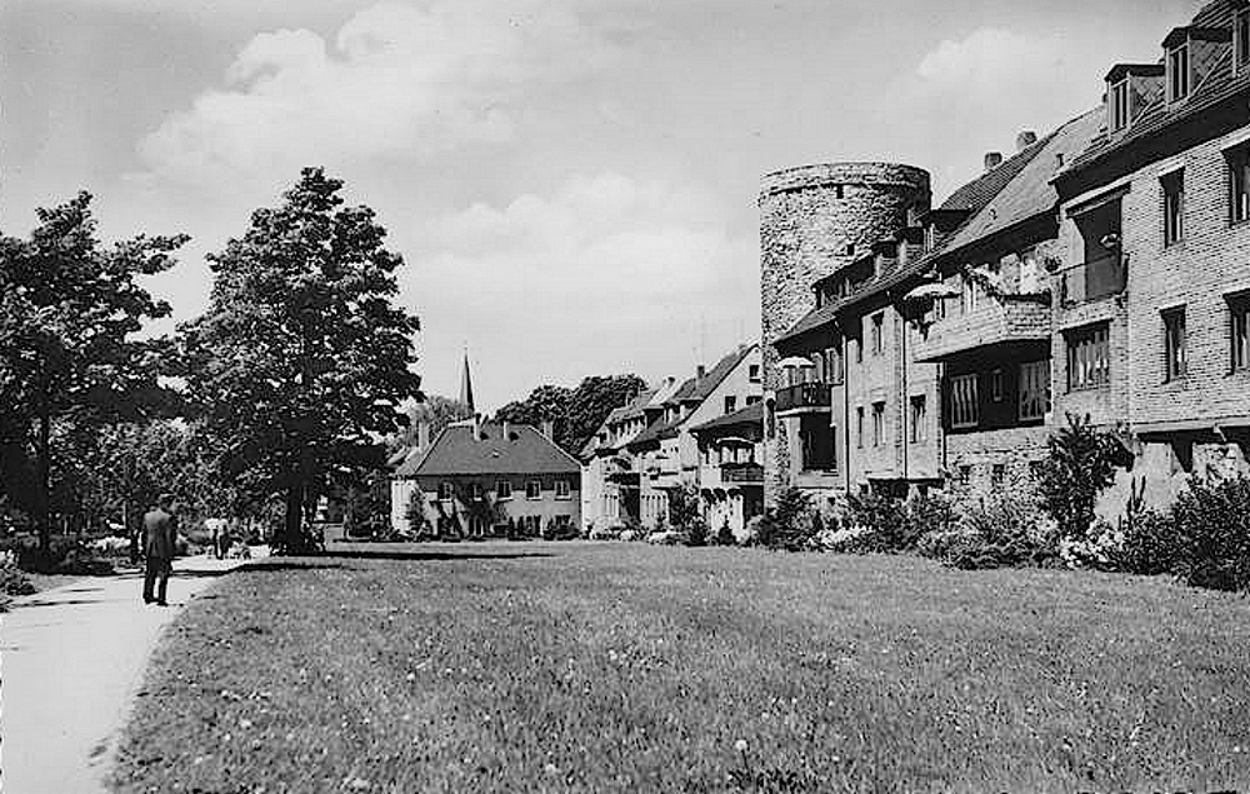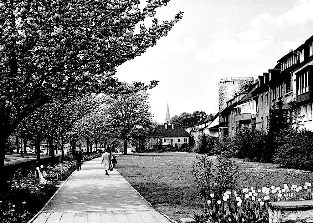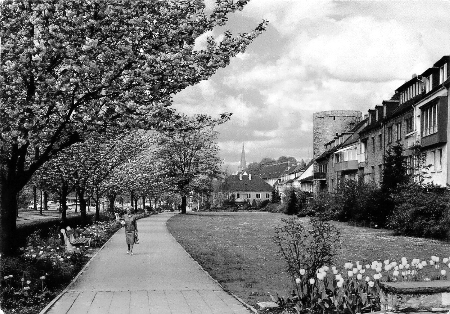 Zum meiner Schulzeit hat sich das Bild verändert, einige Häuser sind verputzt, und an der Franziskanermauer sind neue Gebäude erstellt. Passanten an einem schönen Sommertag an der neunen Liboripromenade.