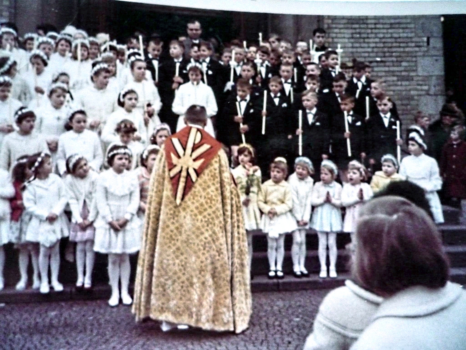 Die Kommunion 1964 mit Vikar Kluge vor dem Eingang der Herz Jesu Schule, man beachte unten rechts die "frommen" Engelchen.