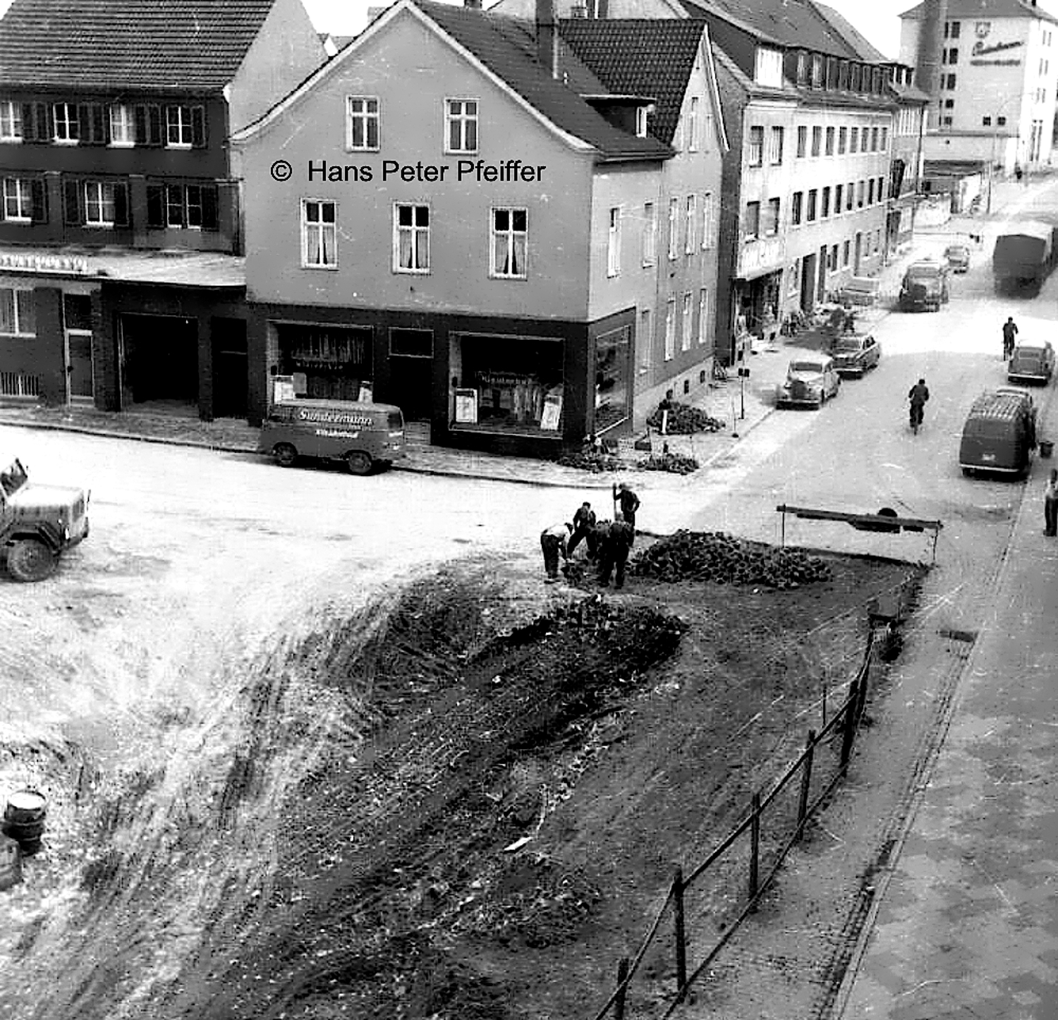 Mit dem Bau der Unterführung wurde an der Pipinstr begonnen. (Wo das Großpflaster wohl hingekommen ist ?) Links die Reinigung Sundermann, dann Borchenerstr Nr. 21, hier hab ich früher oft mit den Zwillingsbrüdern Rechenberg gespielt, gegenüber die Gaststätte: "zum weissen Rössel" , oben am Bildrand ist noch gut die Brauerei zu erkennen, und die schönen alten Autos.