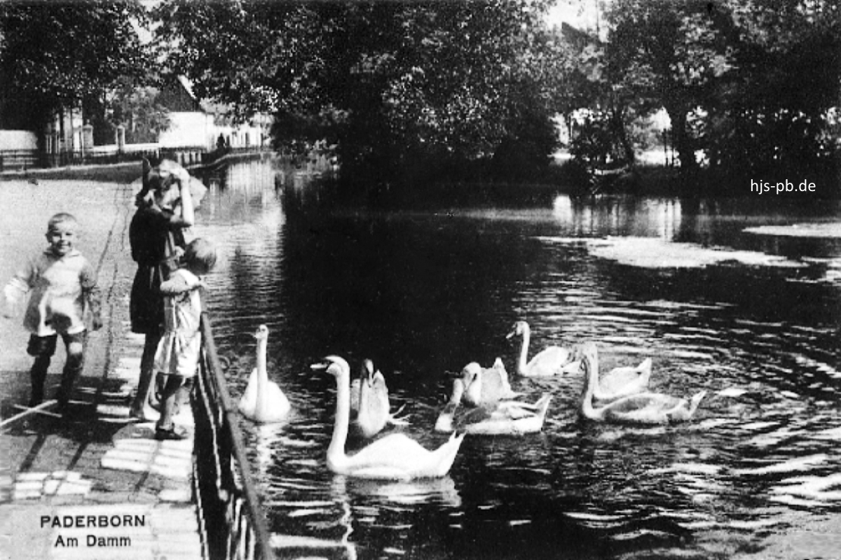 Eine weitere Aufnahme an der "Damm Pader", links sind die Pfeiler vom Kaiser-Karls-Bad erkennbar. Mit mit langen Hälsen warten die Schwäne auf Brotreste.