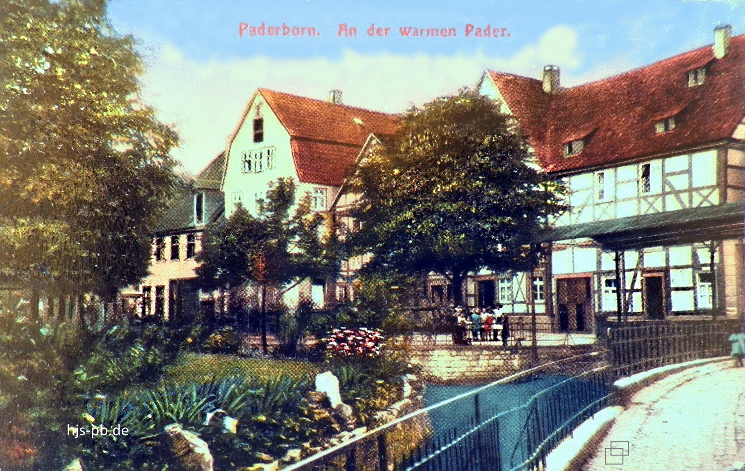 Eine Idylle in Farbe , links die "Damm Pader", rechts "An der Warmen Pader". im Fachwerkhaus links das Wollwarengeschäft Carl Sander.