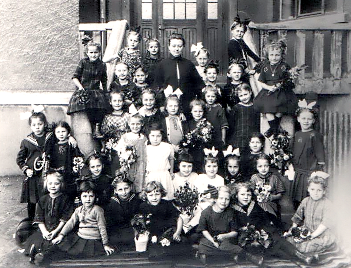 Schon ganz lange her, ein Klassenfoto von der hinteren Treppe des Schulplatz der Herz-Jesu-Schule. Es war sicher ein besonderer Anlass. Alle Mädchen sind adrett angezogen und die Haare wurde eine "Riesige Schleife" gebunden. In den Händen wird ein Bouquet aus Blumen gehalten. Die Blüten sind Kopf an Kopf gebunden, die Manschette besteht aus Blättern oder Papier. Die Lehrerein ist natürlich von ihren Lieblingsschülern umgeben.